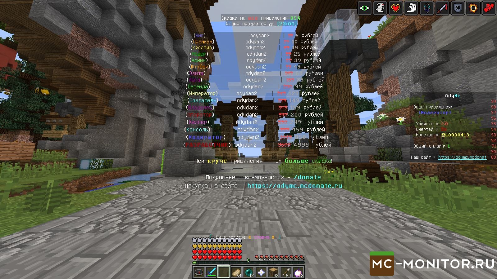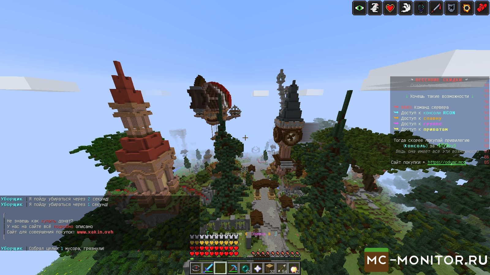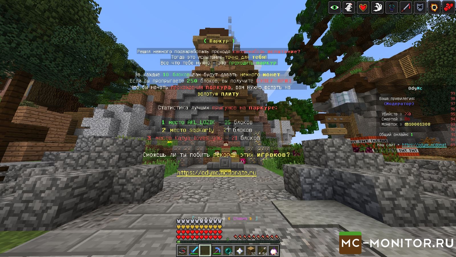 куча ивентов , дешёвый донат, приветливая администрация ,красивый спавн это и многое другое вы найдёте на odymc .АЙПИ: 94.130.137.49:36101