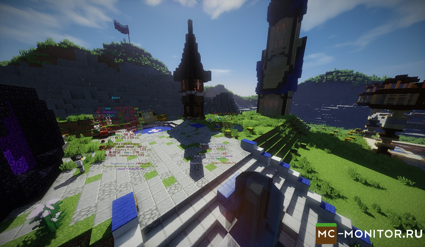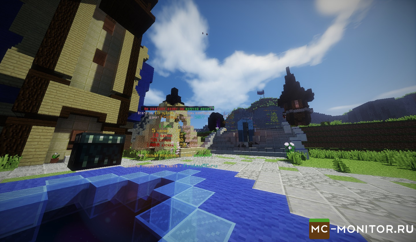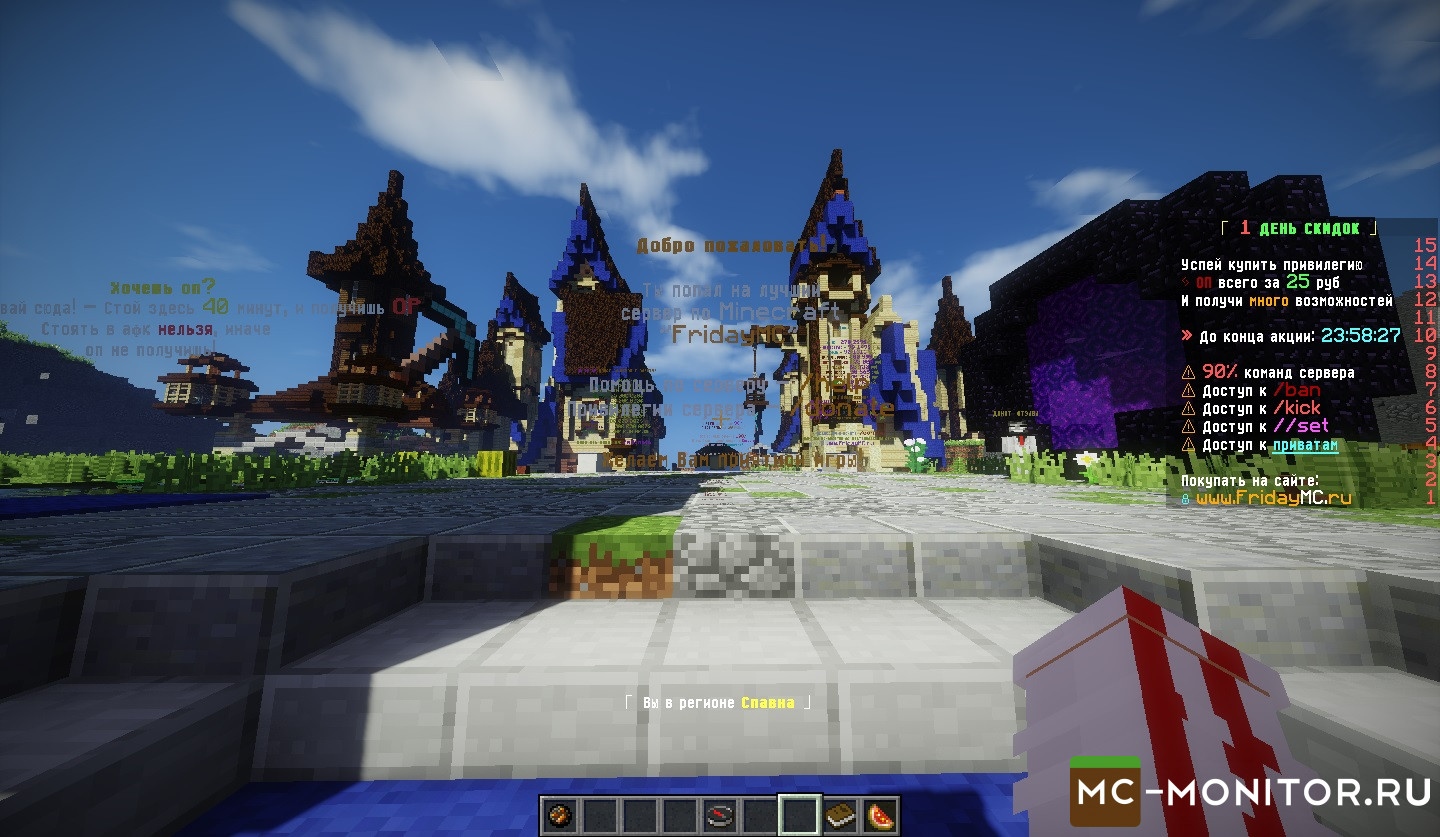 Сейчас я вам расскажу почему же именно FridayMC. На многих серверах есть донат кейсы, но почему их стоит открывать у нас? Что-бы не расстраивать игроков , мы сделали высокий шанс выпадания крутых привилегий. То-есть , вам не обязательно тратить 500 , а то и 1000 рублей на дорогие привилегии, а просто купить 1 кейс за 3 рубля и вы уже сможете окупиться в 5 раз. Мы максимально настроили все донаты, что-бы не было обмана на команды. Так-же у нас есть донат за игровую валюту, но тут уже начинается самое интересное, цены на донат за игровую валю действительно бешеные, НО! Вы можете начать работать, у нас есть 3 активных работы - Дровосек, Шахтёр , Строитель. Так-же вы можете продавать добытые вами ресурсы другим игрокам, что поможет ускорить получения большого количества денег. Так-же присутствует мини-игра на спавне ЦАРЬ-ГОРЫ , если вы простоите 15 секунд на горе , то вы получаете 5000 МОНЕТ, а это действительно круто! Сейчас , я вам советую зайти и просто провести часок на сервере и понять, что мы стараемся для вас. Приятно игры. Ваш FridayMC!